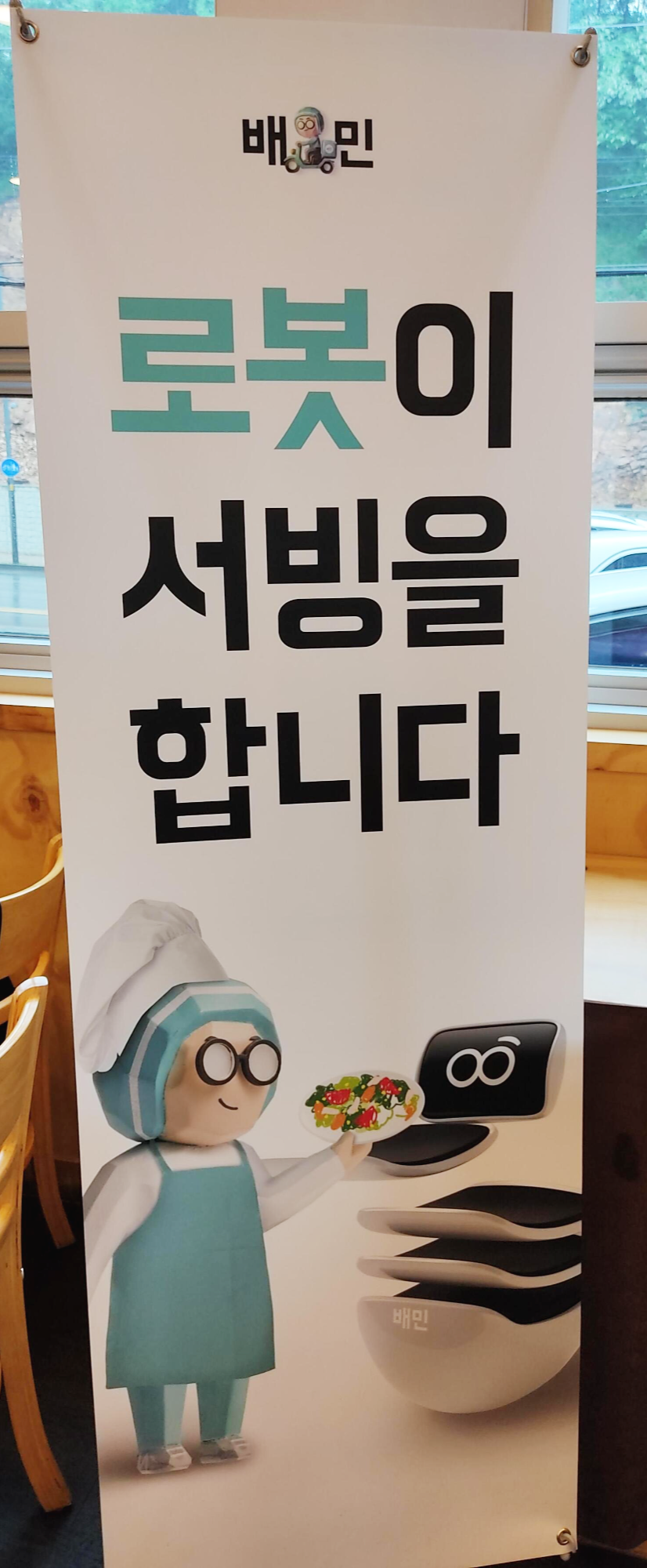 떡 하니, 로봇이 서빙한다고 홍보하고 있다.